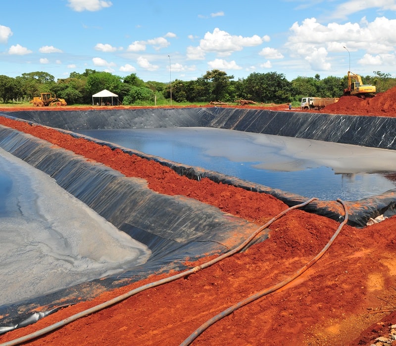 Construção de bacias de armazenamento de resíduos e água. Projeto e construção para a instalação de geotêxtil e geomembrana.